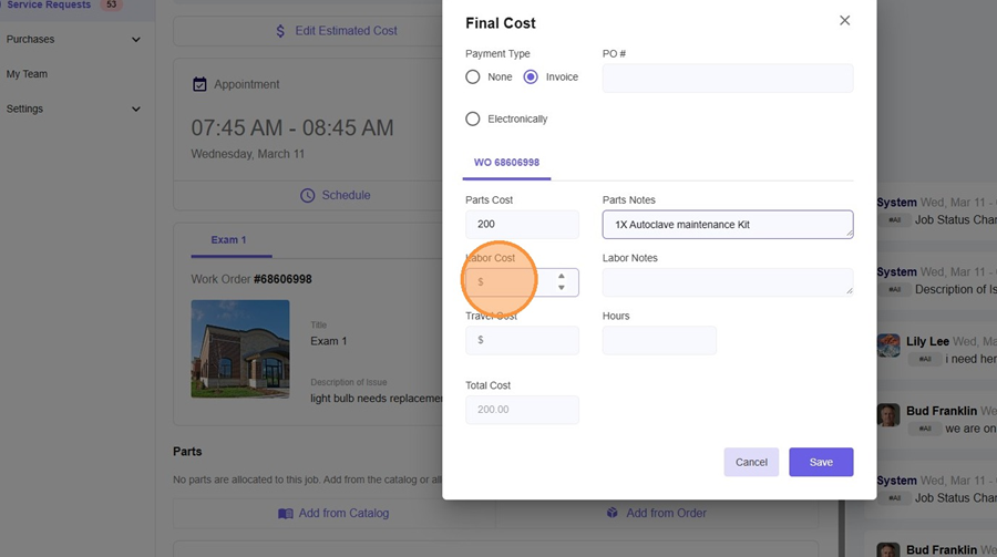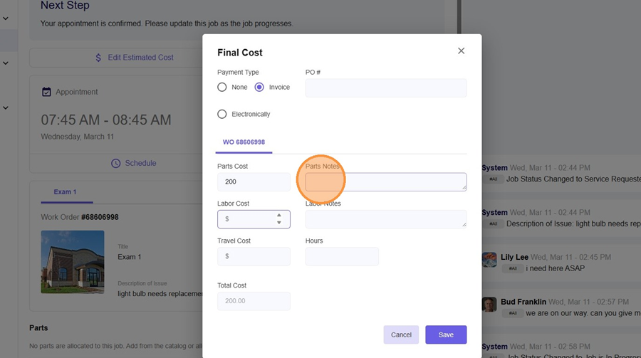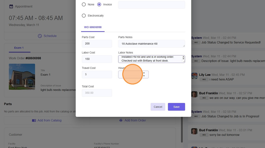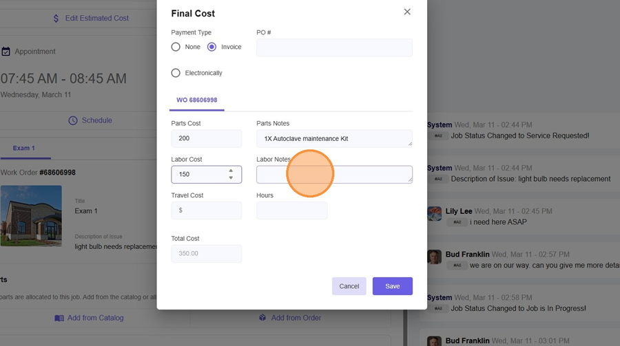 - Click the "Labor Notes" field and enter detailed notes regarding the service: