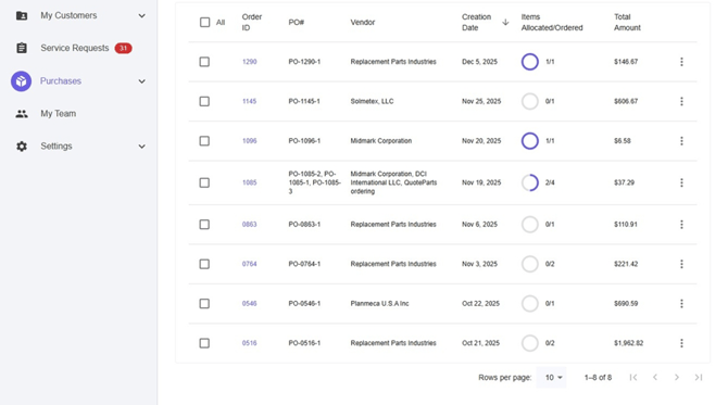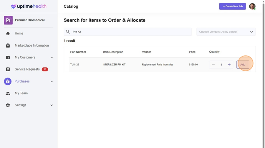 - Select add. This will add the part to the order.