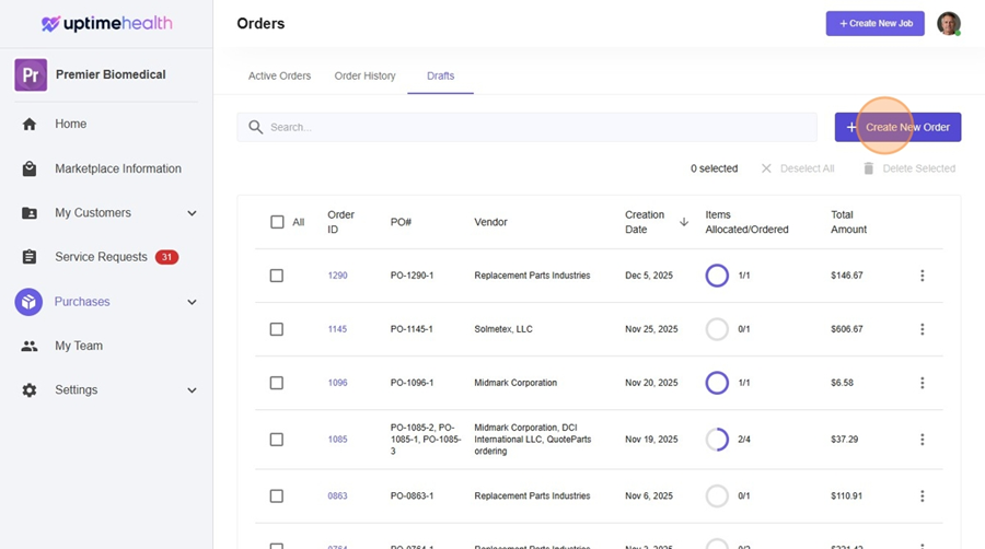 - Navigate to Purchases Section -https://uptimecontroller.com/app/purchase-items/orders?tab=drafts